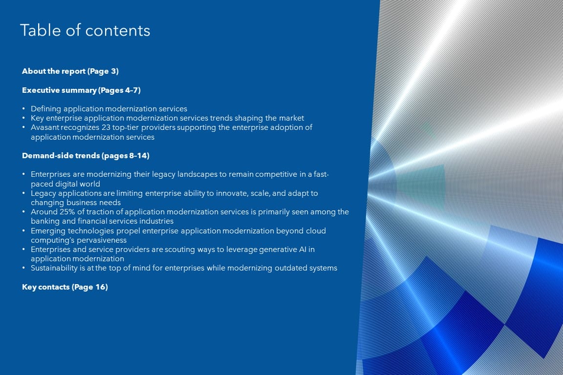 This report identifies key demand-side trends in the application modernization services space, helping enterprises fine-tune their application modernization strategies. It provides an overview of key trends and enterprise challenges that Avasant sees as important to be highlighted in the application modernization strategies services space.