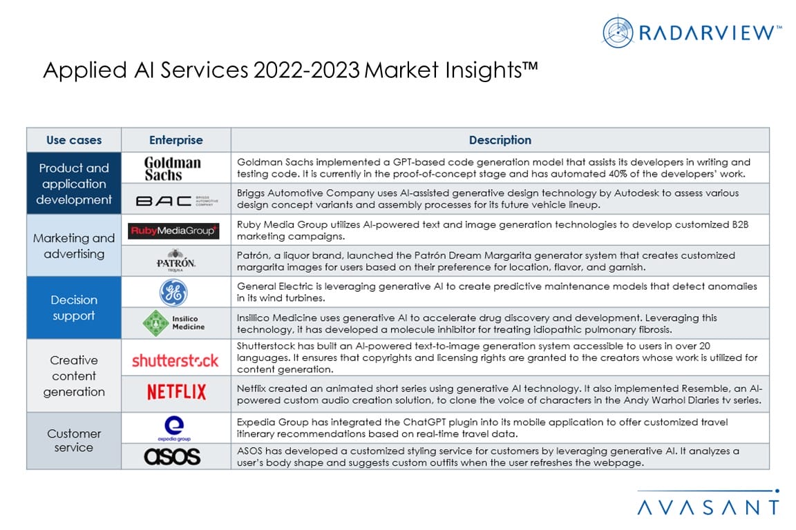 Please refer to Avasant’s Applied AI Services 2022–2023 RadarView™ for detailed insights on the service providers and supply-side trends.