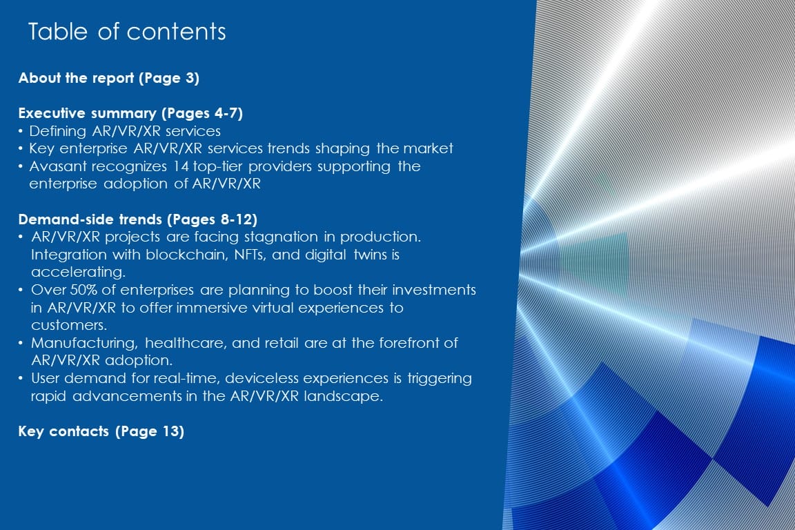 This report identifies key demand-side trends in the AR/VR/XR services space to assist enterprises in their AR/VR/XR journeys. It provides an overview of key trends and enterprise challenges that Avasant considers important to highlight in the AR/VR/XR services space.