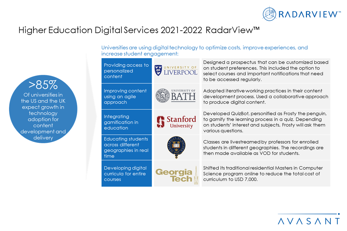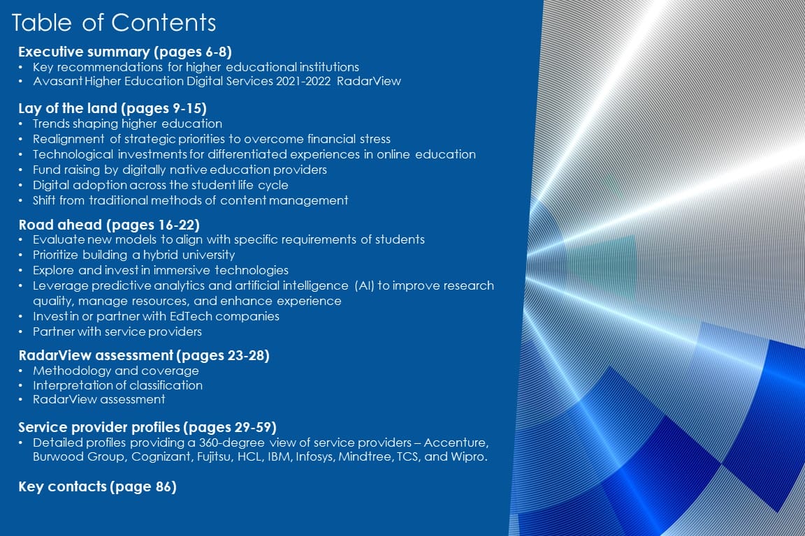 The Higher Education Digital Services 2021–2022 RadarView report addresses the need for educational institutions to evaluate their strategic priorities for future growth. Additionally, it identifies essential global service providers that can help these educational institutions in their business transformation. It brings out detailed capability and experience analyses of leading vendors to assist higher educational institutions in identifying strategic partners for their digital transformation journeys. The 62-page report also highlights key industry trends, the industry’s outlook in the higher education space, and Avasant’s viewpoint on them.