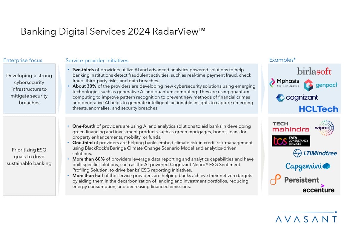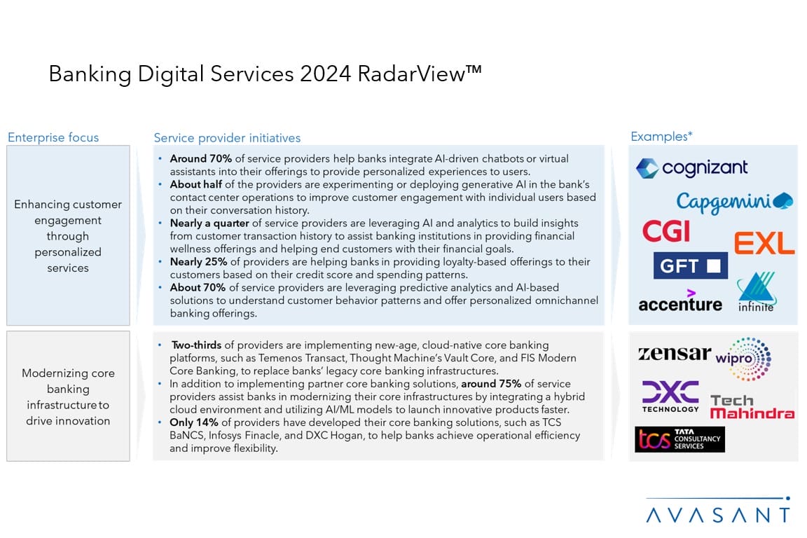 This RadarView includes a detailed analysis of the following service providers: Accenture, Atos, Birlasoft, Capgemini, CGI, Coforge, Cognizant, DXC Technology, EXL, FIS Global, Genpact, GFT, HCLTech, Hexaware, Hitachi Digital Services, IBM, Infinite Computer Solutions, Infosys, LTIMindtree, Mphasis, Persistent Systems, TCS, Tech Mahindra, Unisys, UST, Virtusa, Wipro, and Zensar.