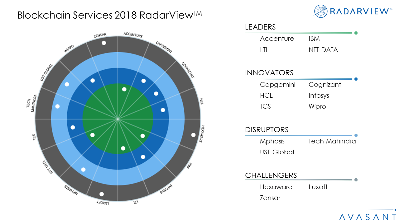 The Blockchain Services RadarView 2018 Report is a tool to address this need and to equip enterprises with a granular understanding of key service providers. This 64 pages report also highlights the key market trends and Avasant’s view on the road ahead for enterprises leveraging Blockchain Services over the next 12 to 18 months.