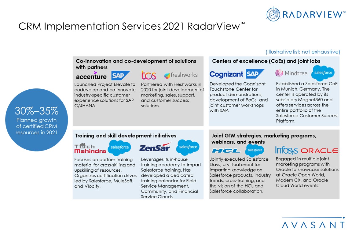 The CRM Implementation Services 2021 RadarView highlights the key market trends in the CRM space and Avasant’s viewpoint. It aids companies in identifying top service providers to assist them in implementation and maintenance of CRM platforms. It also offers an analysis of each service provider’s capabilities in technology and delivery support, thus enabling organizations to identify the right strategic partners for their CRM transformation.