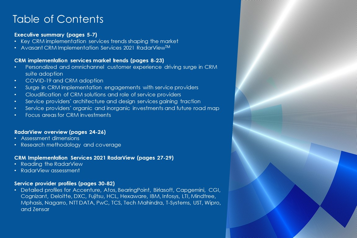 This RadarView includes a detailed analysis of the following CRM service providers: Accenture, Atos, BearingPoint, Birlasoft, Capgemini, CGI, Cognizant, Deloitte, DXC, Fujitsu, HCL, Hexaware, IBM, Infosys, LTI, Mindtree, Mphasis, Nagarro, NTT DATA, PwC, TCS, Tech Mahindra, T-Systems, UST, Wipro, and Zensar.
