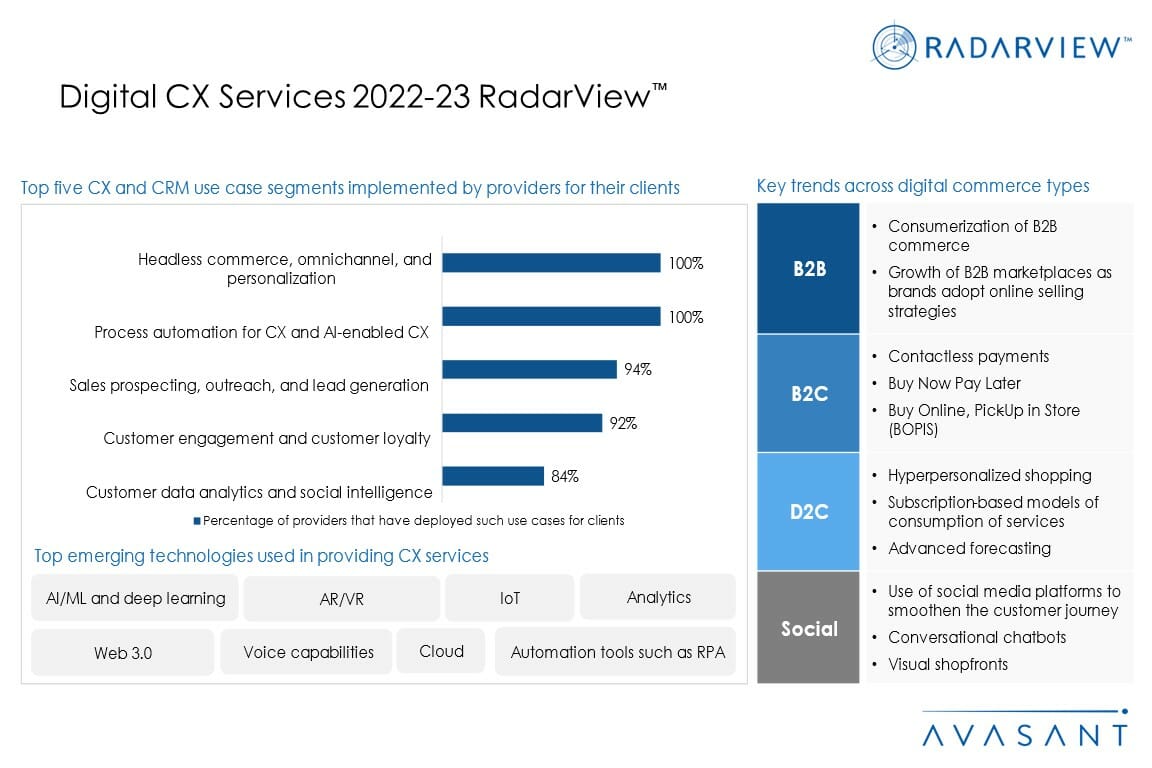 The use of CX services has accelerated as companies are looking to increase customer engagement and create new business. CX has become a key differentiator for enterprise growth, customer retention, and loyalty. The rapid growth of mobile transactions, the use of self-service, and social commerce have accelerated the adoption of CX services in B2B and B2B2C commerce.