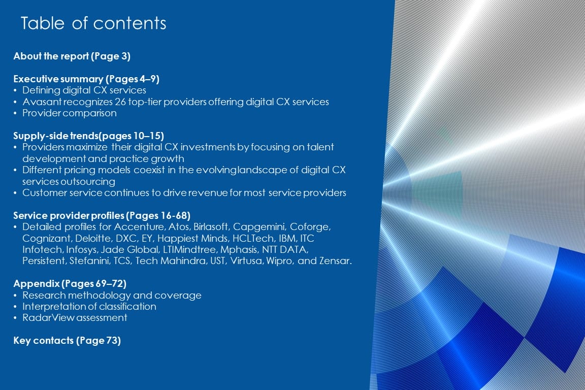 This RadarView helps enterprises identify key service providers to improve CX strategy and drive CX transformation. It begins with a summary of key trends shaping the market and Avasant’s viewpoint on digital CX services over the next 12 to 18 months.