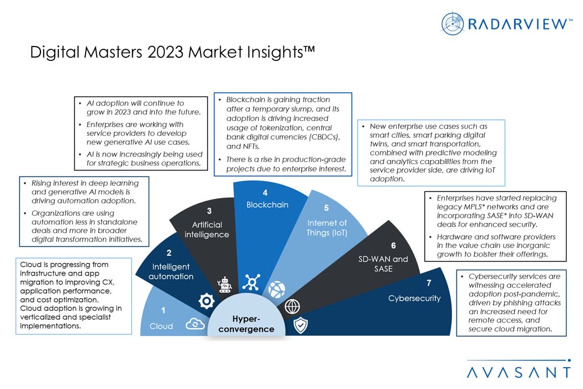 This report is a comprehensive study of enterprise digital technology adoption. It describes top technology trends, best practices, enterprise challenges, and how service providers can hyperconverge key technologies, including cloud, intelligent automation, artificial intelligence and analytics, cybersecurity, Internet of Things, software-defined WAN, and blockchain, to drive digital transformation for enterprise clients. It also highlights the current landscape of generative AI, the key players, recent developments, and trends.