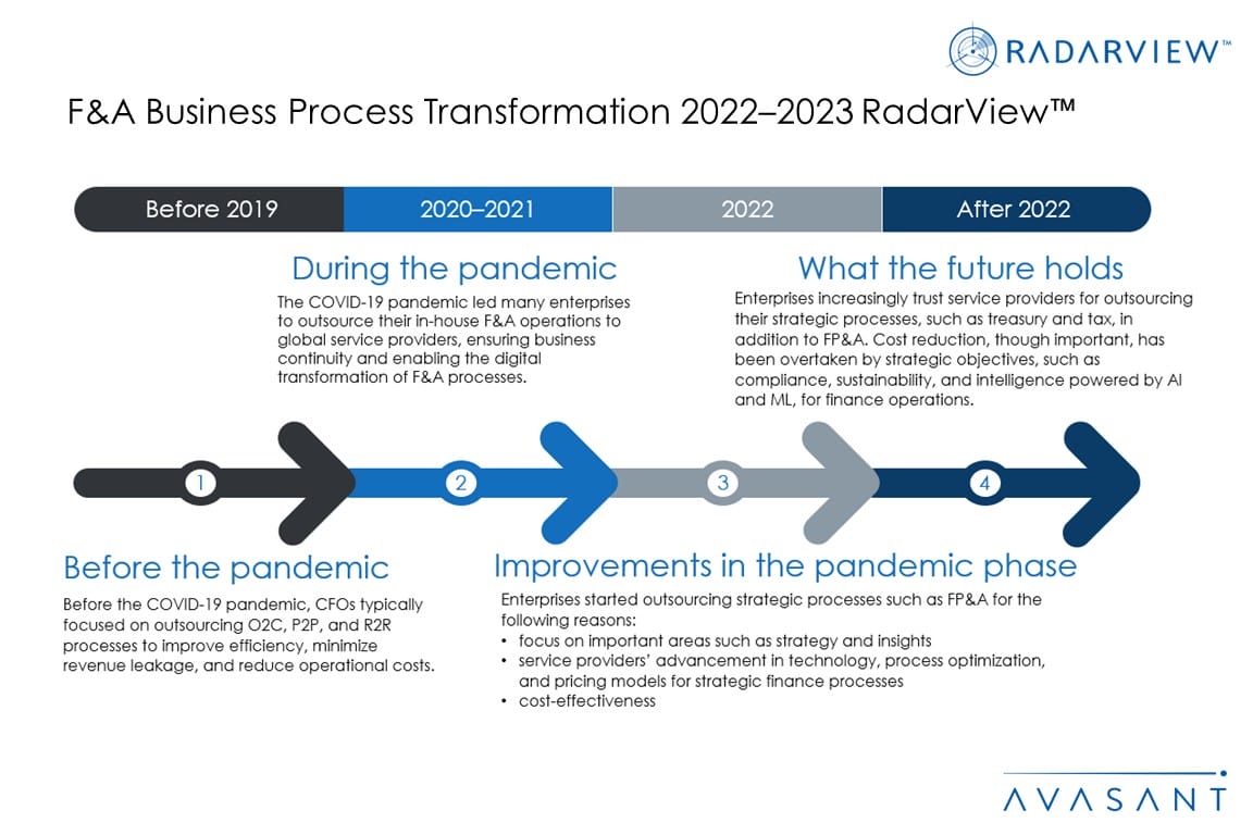 Traditionally, before the pandemic, enterprises focused mostly on outsourcing transaction-intensive F&A processes. However, the pandemic forced businesses to pivot to outsourcing more strategic functions such as finance planning and analysis, tax, and treasury, among others. F&A outsourcing, therefore, grew between 13% and 17% from June 2021 to June 2022. This shift toward strategic outsourcing has helped company CFOs focus their resources on major areas, helping drive better and faster decision-making. F&A service providers are responding with their own range of solutions and services and are becoming an important component in any organization’s finance and accounting cycle.