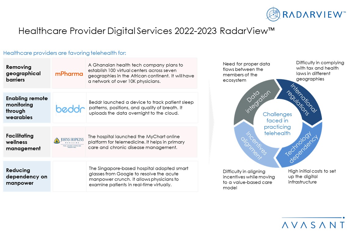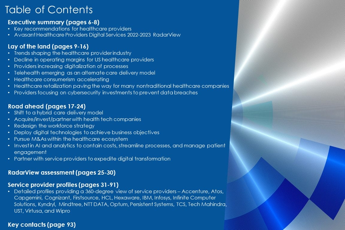 This RadarView includes an analysis of the following service providers in the healthcare provider digital services space: Accenture, Atos, Capgemini, Cognizant, Firstsource, HCL, Hexaware, IBM, Infosys, Infinite Computer Solutions, Kyndryl, Mindtree, NTT DATA, Optum, Persistent Systems, TCS, Tech Mahindra, UST, Virtusa, and Wipro.
