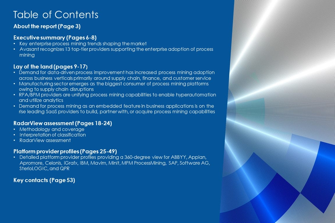 The report highlights key market trends in the intelligent process mining space and Avasant’s viewpoint. It aids companies in identifying top platform providers who can assist them in implementing process mining platforms. It also offers an analysis of each platform provider’s capabilities in technology and delivery support, thereby enabling organizations to identify the right strategic partners for process mining.