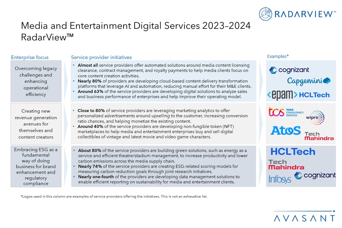 The Media and Entertainment Digital Services 2023–2024 RadarView™ highlights key supply-side trends in the media and entertainment space and Avasant’s viewpoint on them. It aids media and entertainment companies in identifying top service providers to assist them in the digital transformation of their services. It also analyzes each service provider’s capabilities in technology and delivery support, enabling organizations to select the right strategic partners .