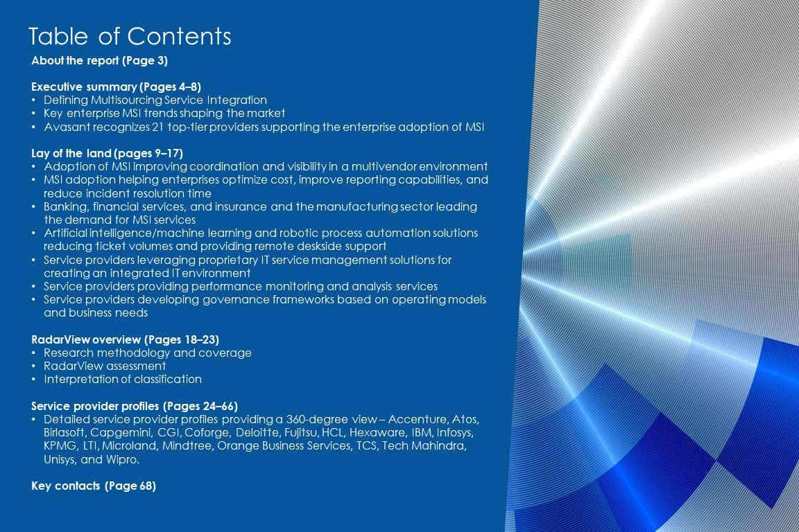 This RadarView includes a detailed analysis of the following MSI service providers: Accenture, Atos, Birlasoft, Capgemini, CGI, Coforge, Deloitte, Fujitsu, HCL, Hexaware, IBM, Infosys, KPMG, LTI, Microland, Mindtree, Orange Business Services, TCS, Tech Mahindra, Unisys, and Wipro.