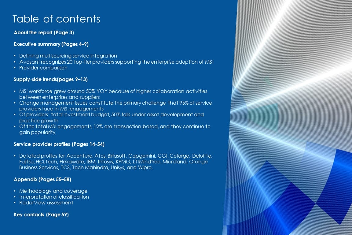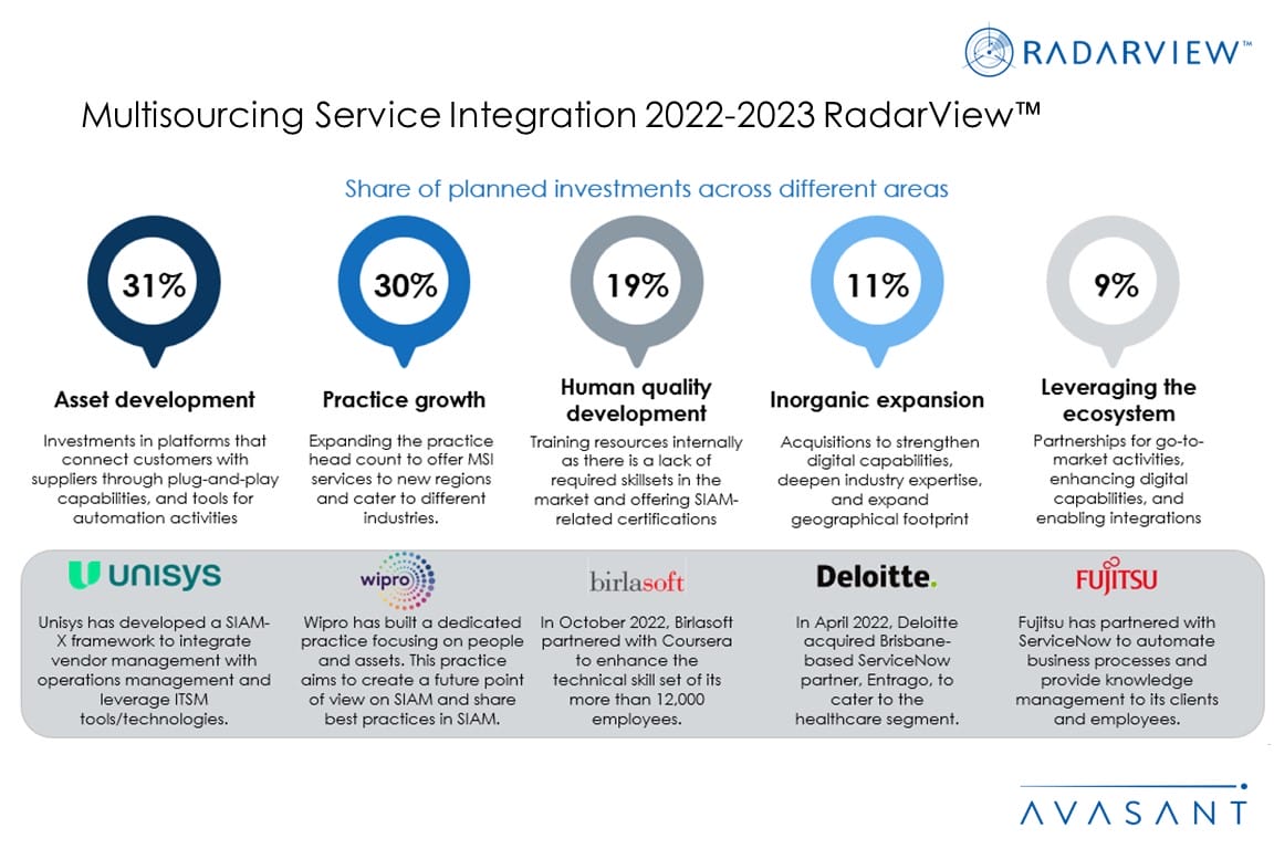 The Multisourcing Service Integration 2022–2023 RadarView highlights key supply-side trends in the MSI space and Avasant’s viewpoint. It aids companies in identifying top service providers to assist them in adopting MSI. It also analyzes each service provider’s capabilities in technology and delivery support, enabling organizations to identify the right strategic partners for MSI.