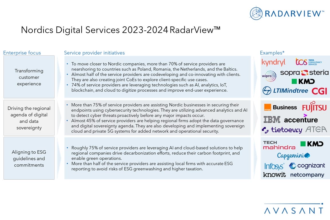 The Nordics Digital Services 2023–2024 RadarView™ highlights key supply-side trends in the Nordic region and Avasant’s viewpoint on them. It aids Nordic-based companies in identifying top service providers to assist them in their digital transformation initiatives. It also analyzes each service provider’s capabilities in technology and delivery support, enabling organizations to identify the right strategic partners.