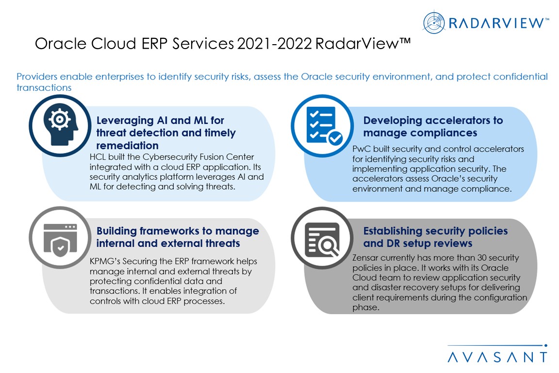 The report features RadarView profiles of 24 service providers, including their solutions, offerings, and experience assisting enterprises in their digital transformation journeys. Oracle Cloud ERP helps enterprises consolidate business processes, improve supply chain visibility, reduce downtime, and automate redundant processes. Artificial intelligence/machine learning (AI/ML) is being leveraged to develop tools, platforms, and solutions integrated with Oracle Cloud ERP to address use cases such as forecasting in real time, eliminating payable errors, and clearing multiple invoices.