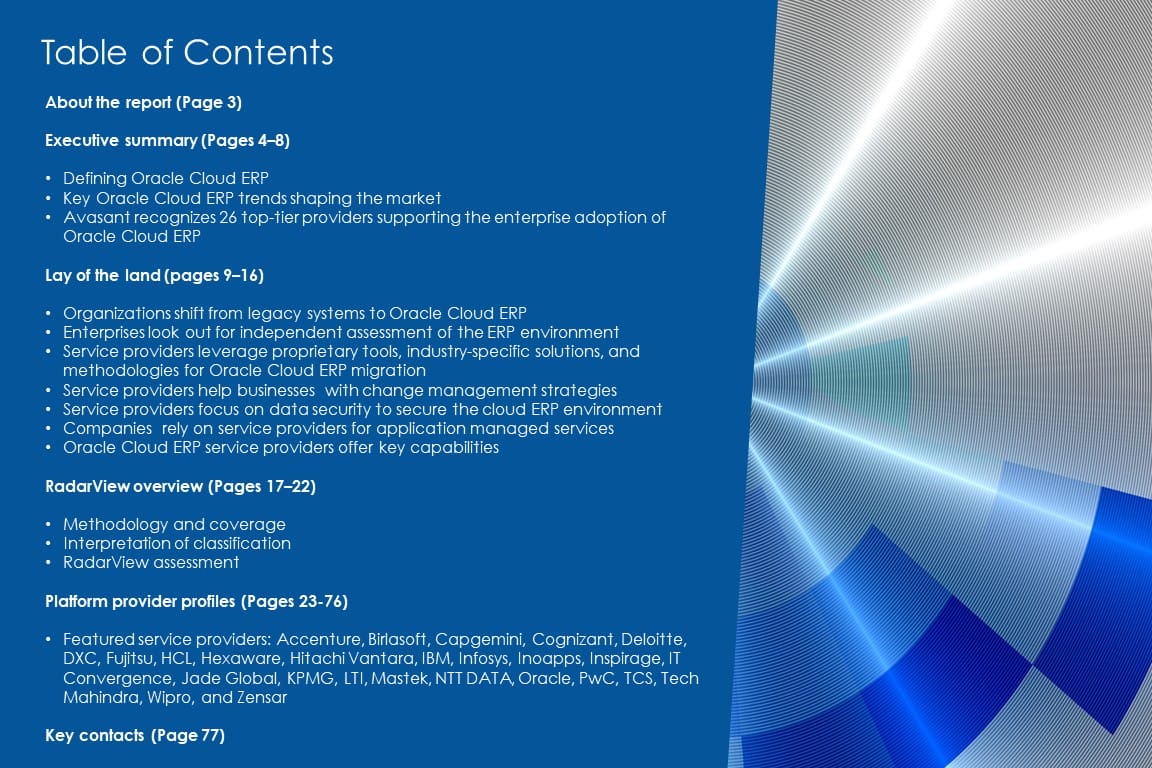 This RadarView includes a detailed analysis of the following Oracle Cloud ERP service providers: Accenture, Birlasoft, Capgemini, Cognizant, Deloitte, DXC, Fujitsu, HCL, Hexaware, Hitachi Vantara, IBM, Infosys, Inoapps, Inspirage, IT Convergence, Jade Global, KPMG, LTI, Mastek, NTT DATA, Oracle, PwC, TCS, Tech Mahindra, Wipro, and Zensar.