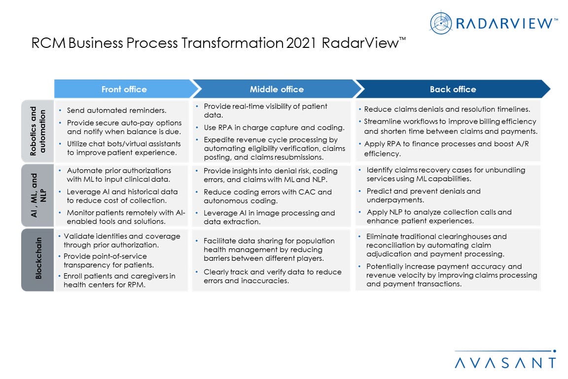 The RCM Business Process Transformation 2021 RadarView highlights the key outsourcing trends in the RCM space and Avasant’s viewpoint on them. It aids companies in identifying top service providers to assist them in transforming their RCM operations. It also offers an analysis of each service providers’ capabilities in technology, domain expertise, and delivery-related support, thus enabling healthcare organizations to identify the right strategic partners for their RCM transformation.