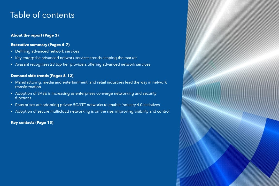 This report identifies key demand-side trends in the advanced network services space, helping enterprises fine-tune their advanced network adoption strategies. It consists of key trends and enterprise business challenges in the advanced network services space based on Avasant’s assessment.