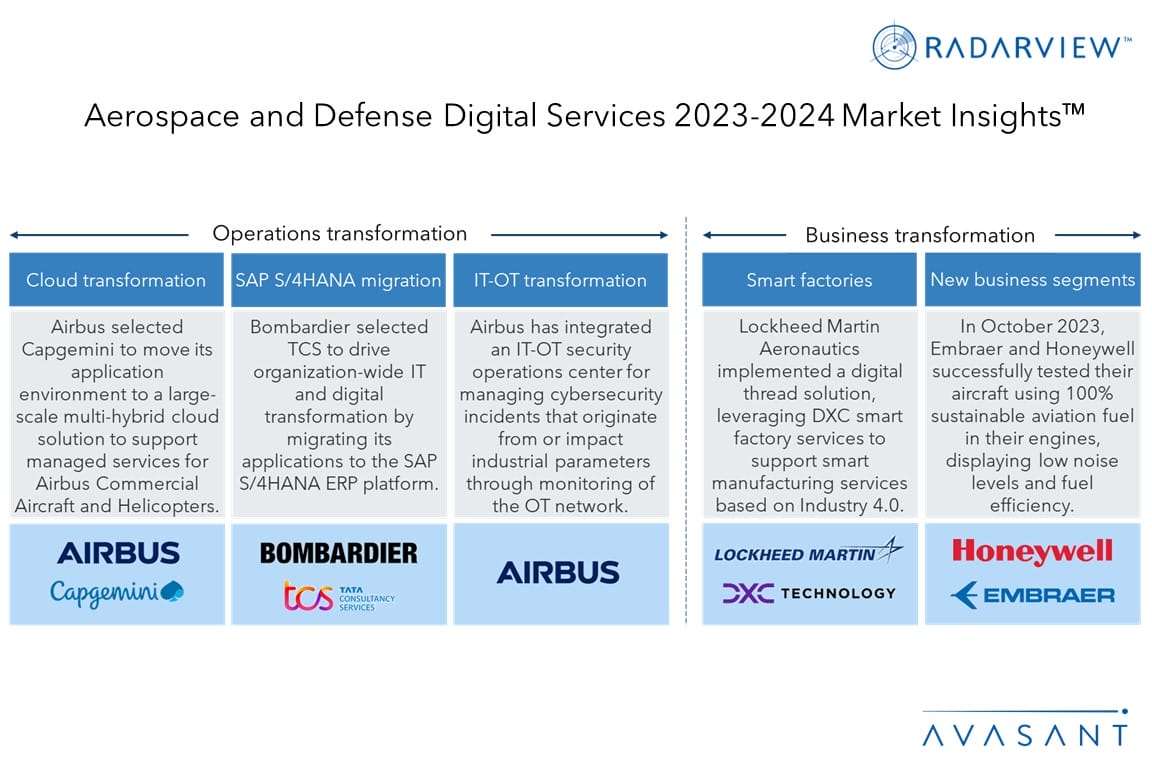 Aerospace and defense (A&D) enterprises are facing challenges arising from supply chain risks, regulatory compliance, increasing operational costs, heightened security measures, and pressure to meet sustainability goals. To address these critical issues, companies are actively harnessing the power of digital technologies to revolutionize their manufacturing processes, maintenance, repair, and overhaul (MRO) activities, and supply chain operations. Exploring advanced technologies, including generative AI, AR/VR, and digital twins, these enterprises aim to enhance productivity and refine operational workflows. As this requires strong technological expertise and delivery capabilities, A&D enterprises are collaborating with service providers for digital transformation.