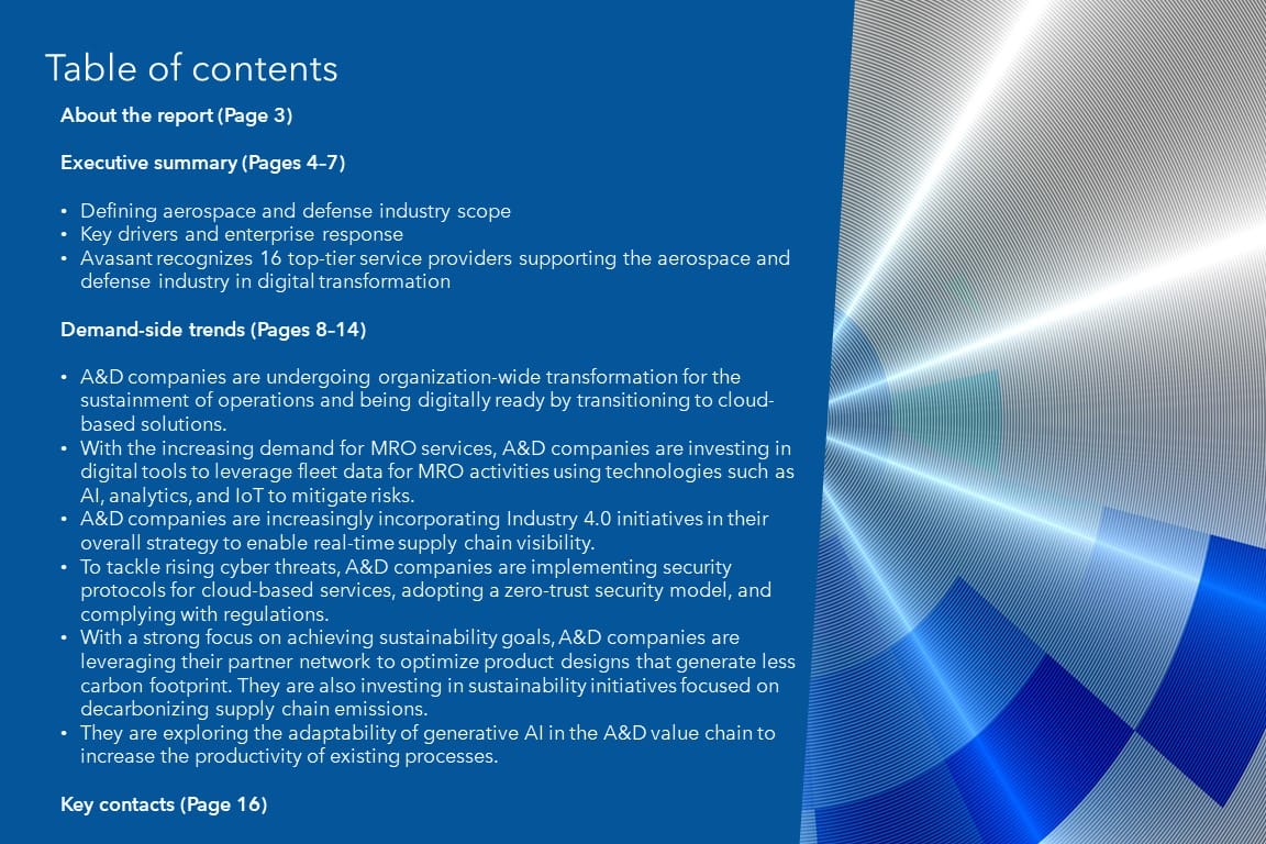 Please refer to Avasant’s Aerospace and Defense Digital Services 2023–2024 RadarView™ for detailed insights on the service providers and supply-side trends.