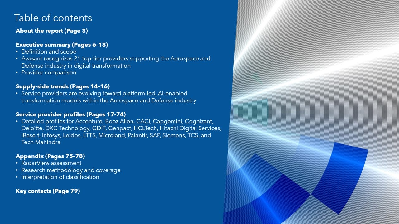 The Aerospace and Defense Digital Services 2025–2026 RadarView™ highlights key supply-side trends in this space and Avasant’s viewpoint on them. It aids companies in this industry in identifying top service providers to assist them in the digital transformation of their services. It also analyzes each service provider’s capabilities in technology and delivery support, enabling organizations to select the right strategic partners for the Aerospace and Defense industry.