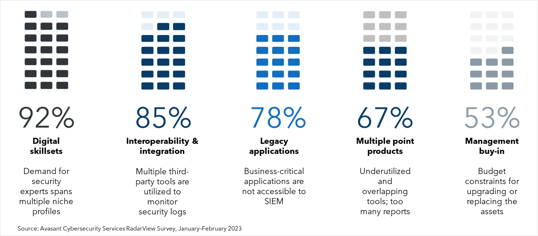 4. Enterprises are overwhelmed by operational complexity and tool sprawl: Most large organizations now operate dozens of infrastructure and security tools across networks, clouds, data centers, and endpoints. According to Avasant’s Cybersecurity Services 2023 Market Insights™ report, 67% of enterprise customers struggle with managing multiple point tools, leading to underutilization and overlapping use cases, while 85% face interoperability and integration challenges across third-party security tools used to monitor logs and events.