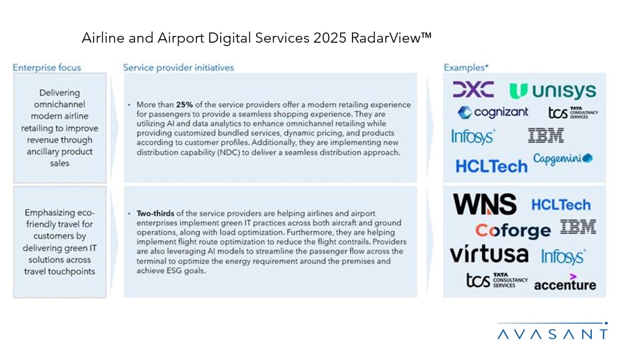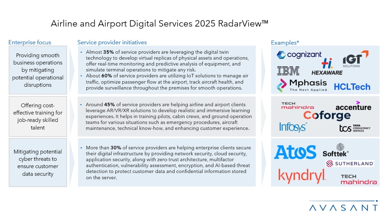 The Airlines and Airports Digital Services 2025 RadarView™ highlights key supply-side trends in the airline and airport space and Avasant’s viewpoint on them. It aids companies in this industry in identifying top service providers to assist them in the digital transformation of their services. It also analyzes each service provider’s capabilities in technology and delivery support, enabling organizations to select the right strategic partners .