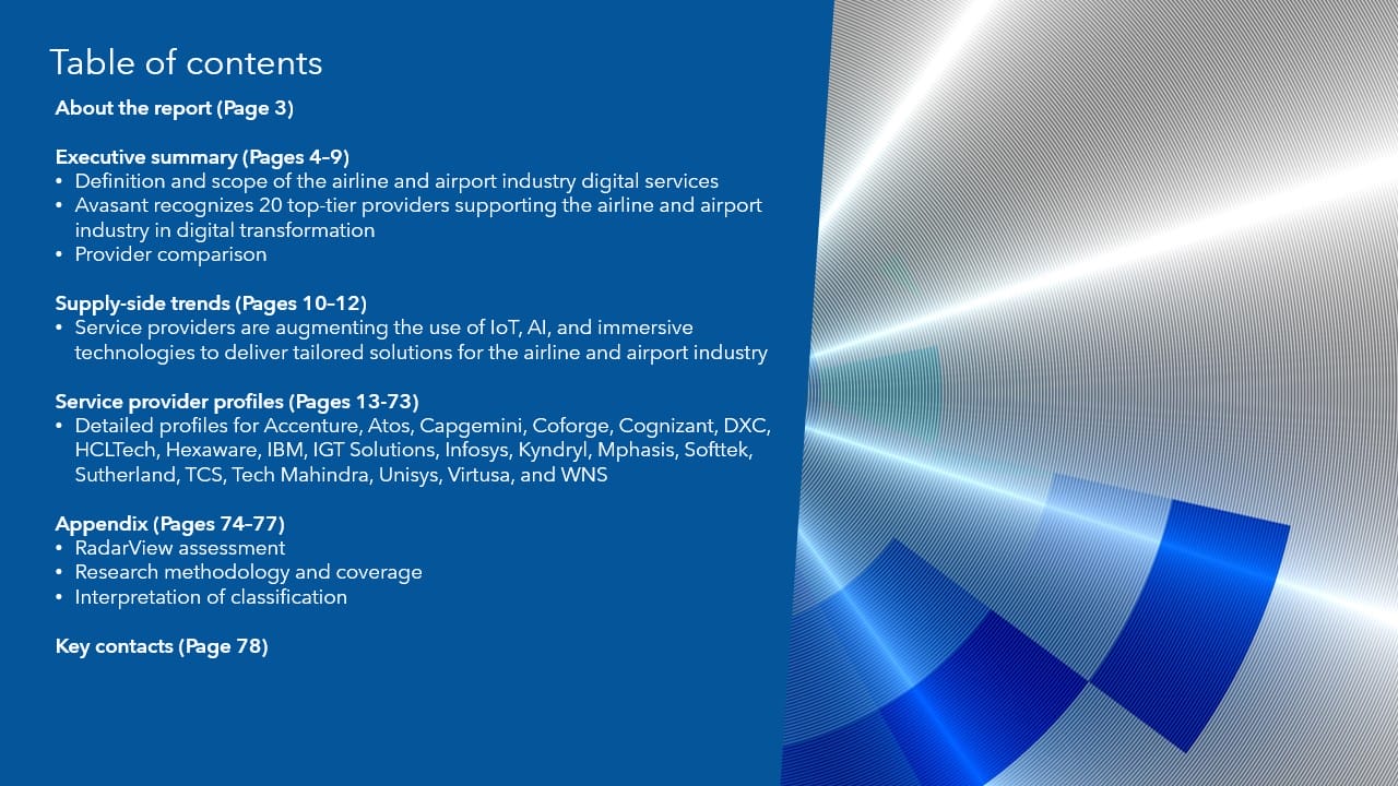 This RadarView™ helps airline and airport enterprises craft a robust strategy based on industry outlook, best practices, and digital transformation. It begins with a summary of key trends shaping the supply side of the market. It continues with a detailed assessment of 20 providers offering digital services in the airline and airport industry. Each profile gives an overview of the service provider, its industry-specific solutions, and a list of representative clients and partnerships, along with brief client case studies. Each profile concludes with analyst insights on the provider’s practice maturity, investments and innovation, and partner ecosystem.