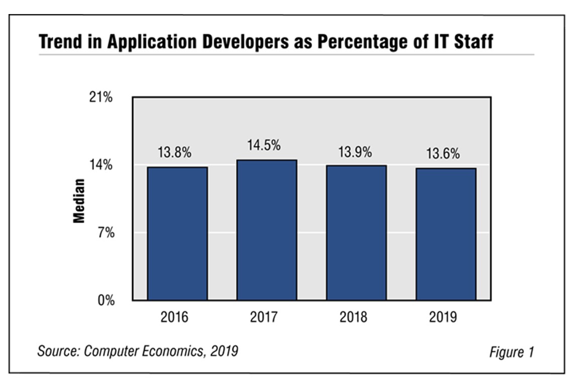 With the use of agile and advent of DevOps, the way that applications are being developed in the enterprise is changing. With these changes, the need for application developers is in flux, and IT organizations can benefit from periodic assessment of their staffing levels. This study uses three metrics to make that assessment: developers as a percentage of the IT staff, users per developer, and applications per developer. We provide benchmarks for the composite sample, by organization size and by sector. We also provide a benchmark for the larger Application Group, which includes personnel engaged in application maintenance, web development and support, quality assurance, data management, and business systems analysis. (22 pp., 9 fig.)