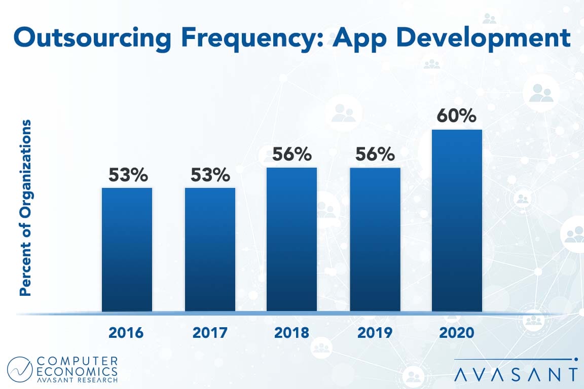 The outsourcing of the application development function grew a noticeable amount in our annual IT Outsourcing Statistics study after two years being stuck at a lower percentage. Why the uptick? For starters, there is much going on in the application development universe. This report examines adoption trends and customer experience with application development outsourcing. We report on the percentage of organizations outsourcing it (frequency), the average amount of work outsourced (level), and the change in the amount of work being outsourced (trend). We also present data on the cost and service experience and on how these trends differ by organization size and sector. We conclude with guidelines to consider when outsourcing application development. (8 pp., 2 fig.)