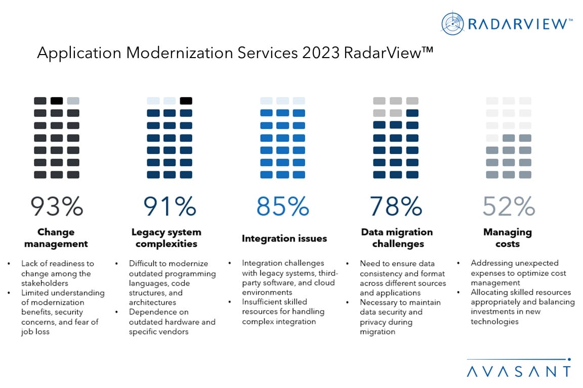 The Application Modernization Services 2023 RadarView™ highlights key supply-side trends in the application modernization space and Avasant’s viewpoint on them. It aids companies in identifying top service providers to assist them in adopting application modernization services. It also analyzes each service provider’s capabilities in technology and delivery support, enabling organizations to identify the right strategic partners for modernizing their applications.