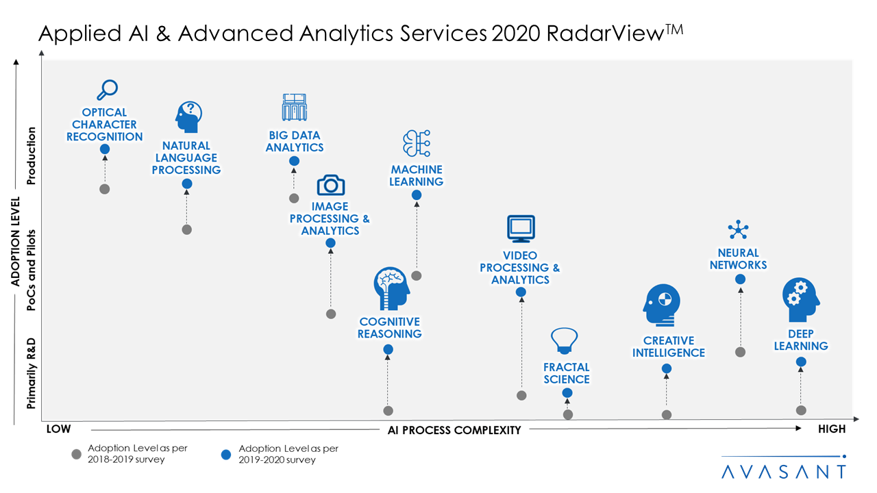 The rapid evolution of cognitive technologies is not only improving the existing AI & Advanced Analytics solutions but also conceptualizing newer and more complex use cases. This is constantly expanding the frontier of AI-led transformation potential. This is encouraging enterprises to undertake function- and enterprise-wide AI deployments. Avasant’s ongoing interactions with enterprise digital leaders indicate that AI is now an integral part of their digital transformation blueprints. However, their endeavors are fructifying later than expected due to the diversity and legacy of technology environments and lack of implementation experience.