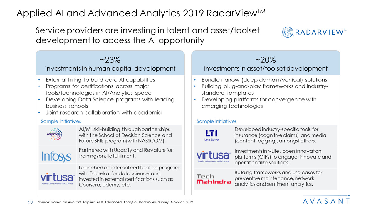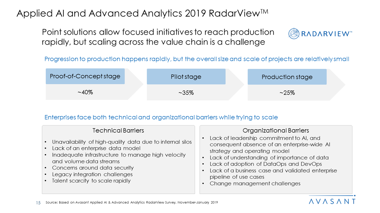 The adoption of Applied AI and Advanced Analytics technology is growing across industry value chains to enhance customer engagement and improve operations. Most enterprises are already past the experimentation phase and are actively leveraging AI in specific pockets of their business environments. Avasant’s ongoing interactions with enterprise digital leaders indicate that while there is broad acceptance of implementing AI in specific use cases, enterprises are struggling with scaling it across the organization value chain. There is an enterprise need to identify mature service providers that will partner in their AI journey.