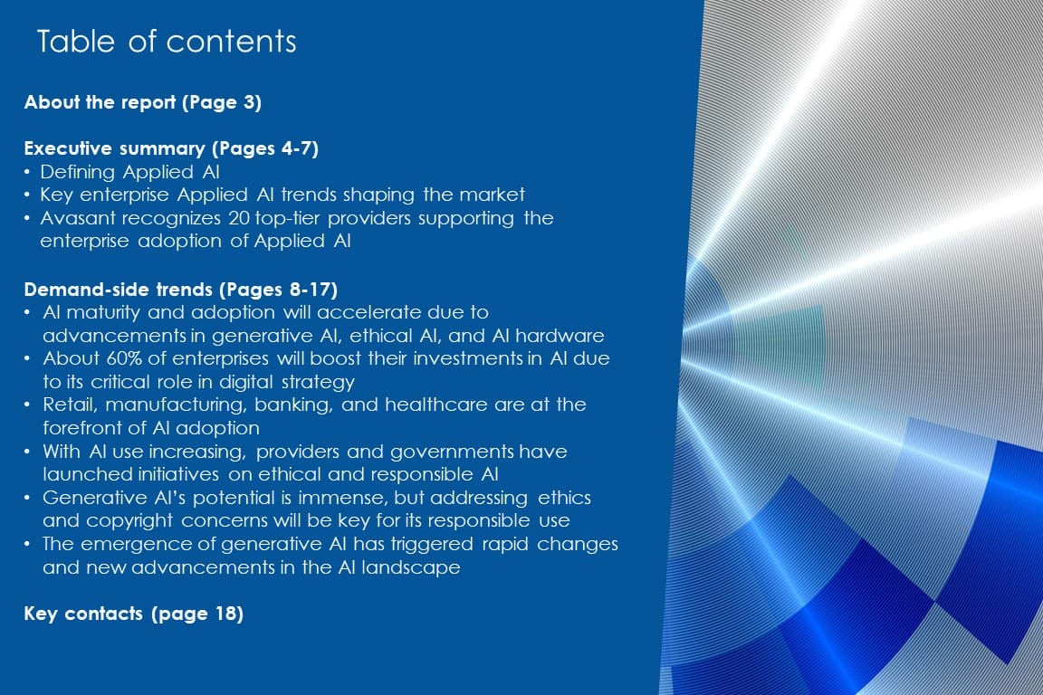 This report identifies key demand-side trends in the applied AI services space to assist enterprises in their AI journeys. It provides an overview of key trends and enterprise challenges that Avasant considers important to highlight in the applied AI services space.