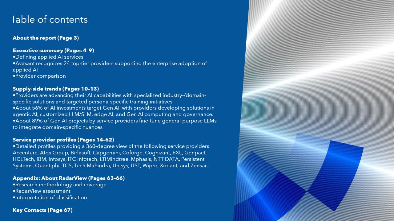 This RadarView includes a detailed analysis of the following applied AI service providers: Accenture, Atos Group, Birlasoft, Capgemini, Coforge, Cognizant, EXL, Genpact, HCLTech, IBM, Infosys, ITC Infotech, LTIMindtree, Mphasis, NTT DATA, Persistent Systems, Quantiphi, TCS, Tech Mahindra, Unisys, UST, Wipro, Xoriant, and Zensar.