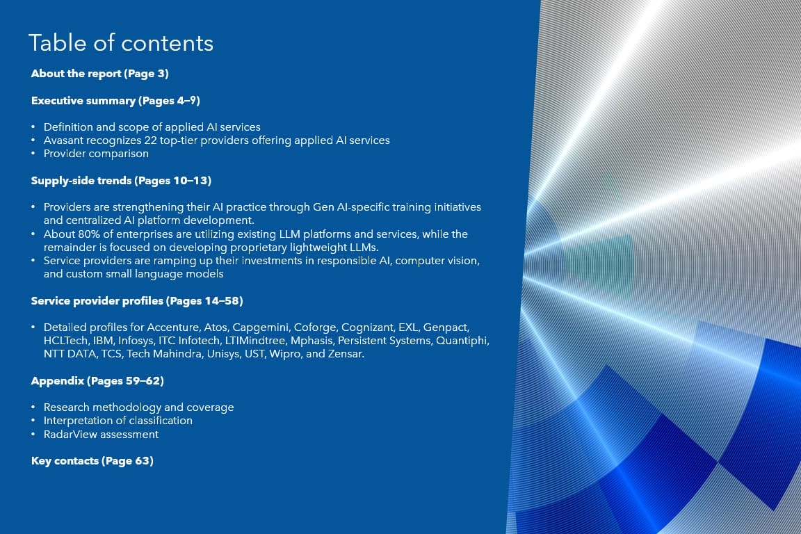 This RadarView includes a detailed analysis of the following applied AI service providers: Accenture, Atos, Capgemini, Coforge, Cognizant, EXL, Genpact, HCLTech, IBM, Infosys, ITC Infotech, LTIMindtree, Mphasis, Persistent Systems, Quantiphi, NTT DATA, TCS, Tech Mahindra, Unisys, UST, Wipro, and Zensar.