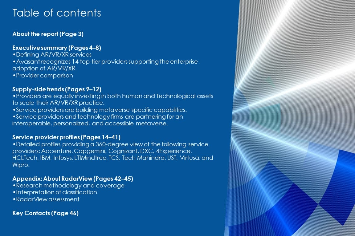 This RadarView includes a detailed analysis of the following AR/VR/XR service providers: Accenture, Capgemini, Cognizant, DXC, 4Experience, HCLTech, IBM, Infosys, LTIMindtree, TCS, Tech Mahindra, UST, Virtusa, and Wipro.