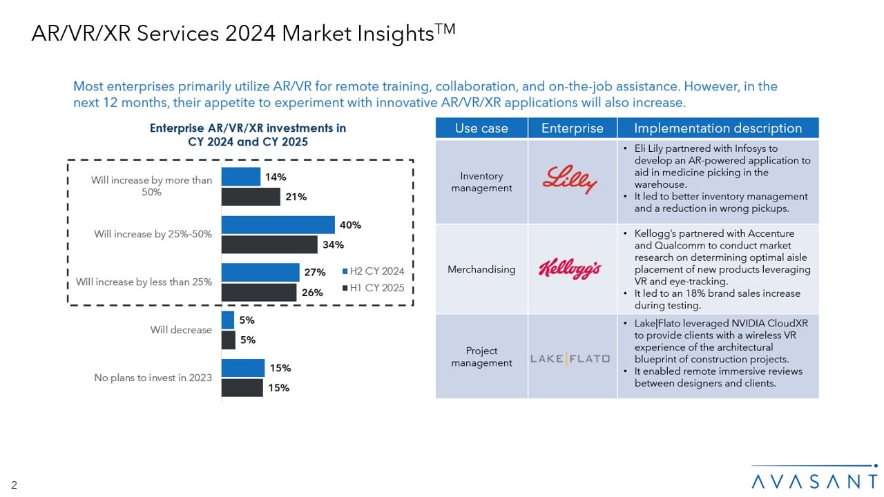 This report identifies key demand-side trends in the AR/VR/XR services space to assist enterprises in their AR/VR/XR journeys. It provides an overview of key trends and enterprise challenges that Avasant considers important to highlight in the AR/VR/XR services space.