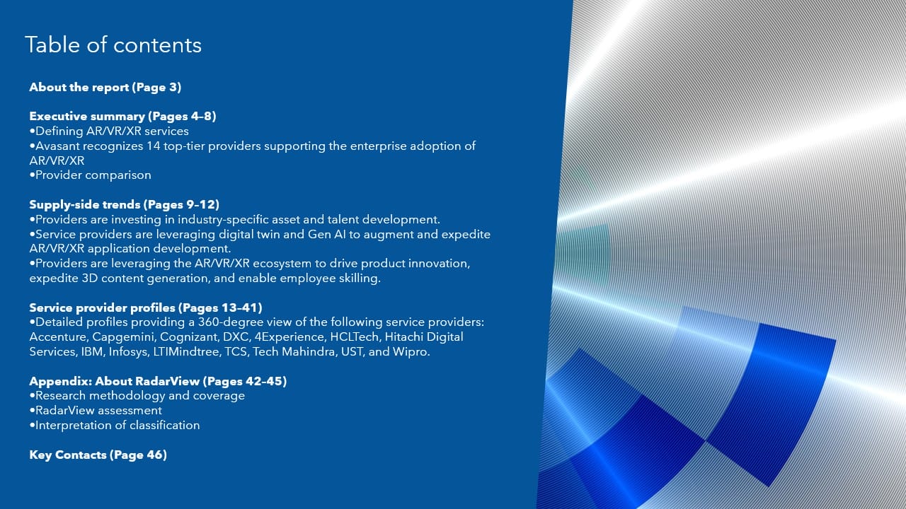 This RadarView™ includes a detailed analysis of the following AR/VR/XR service providers: Accenture, Capgemini, Cognizant, DXC, 4Experience, HCLTech, Hitachi Digital Services, IBM, Infosys, LTIMindtree, TCS, Tech Mahindra, UST, and Wipro.