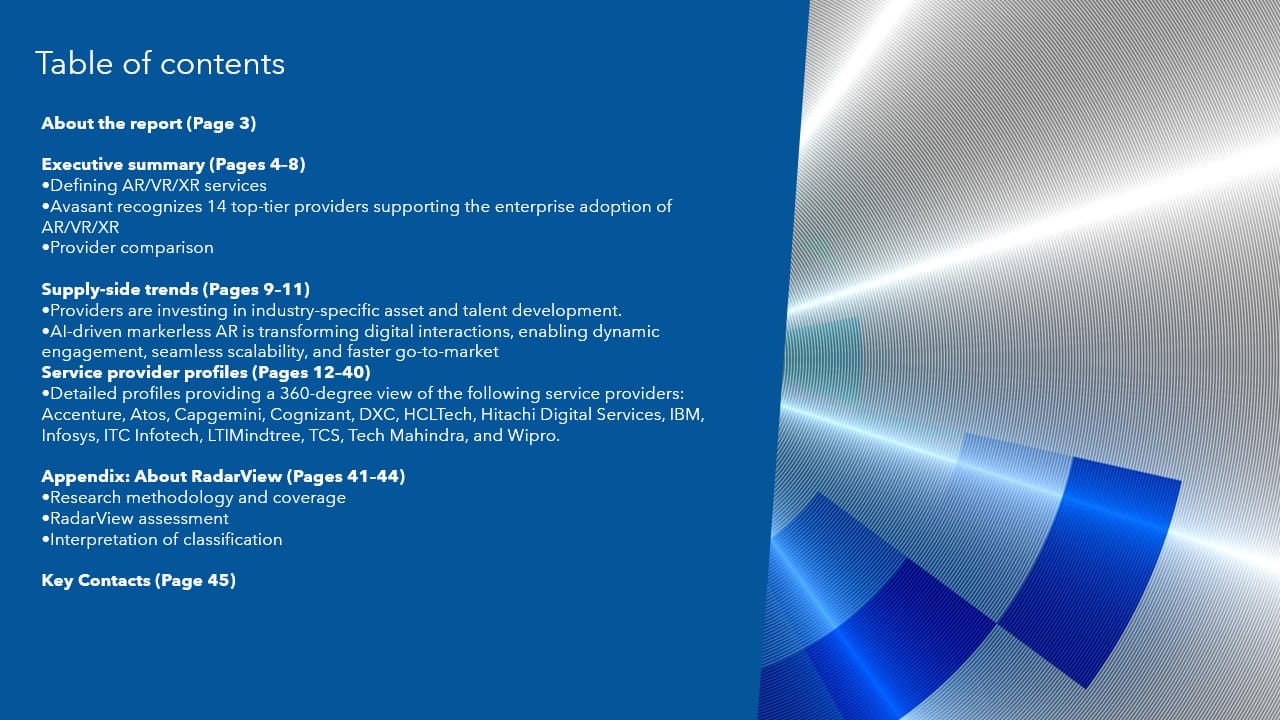 This RadarView includes a detailed analysis of the following AR/VR/XR service providers: Accenture, Atos, Capgemini, Cognizant, DXC, HCLTech, Hitachi Digital Services, IBM, Infosys, ITC Infotech, LTIMindtree, TCS, Tech Mahindra, and Wipro.