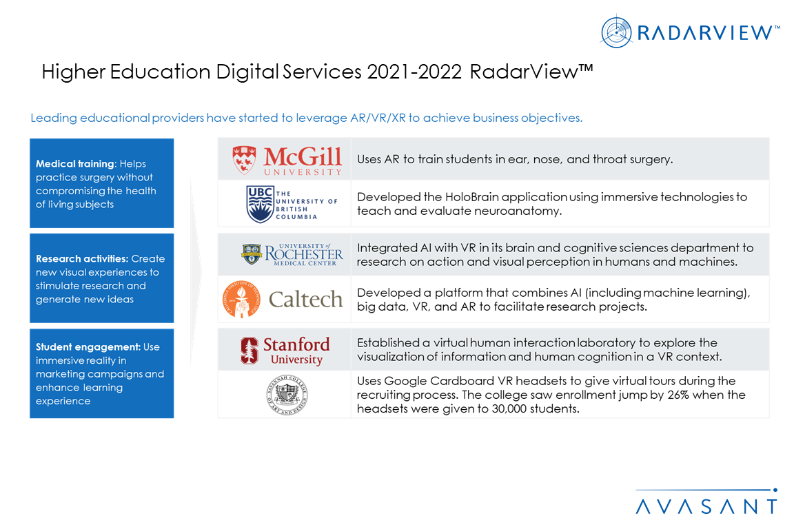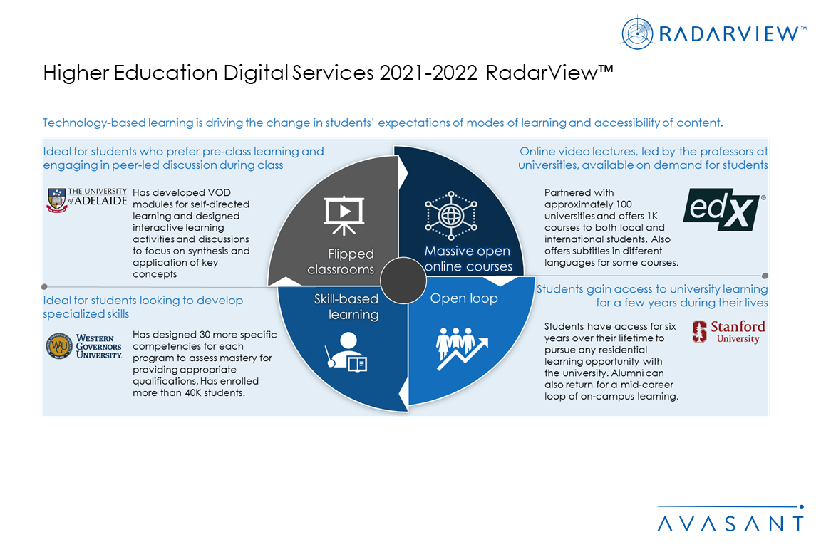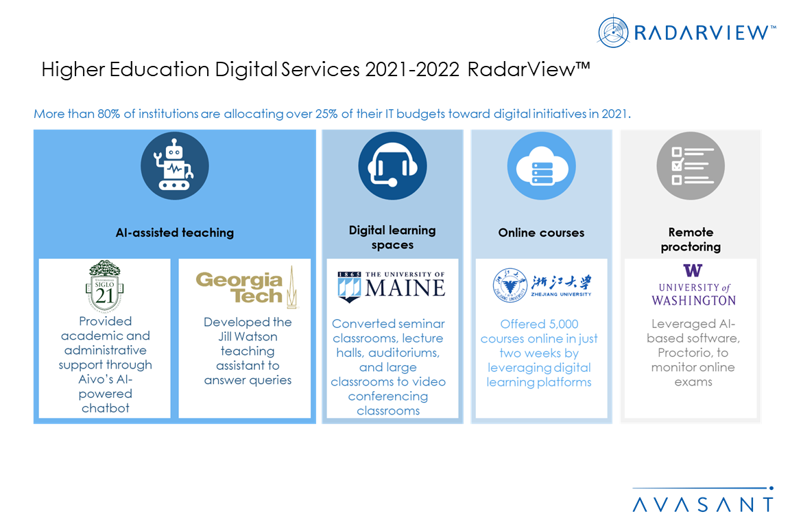 The Higher Education Digital Services 2021–2022 RadarView report addresses the need for educational institutions to evaluate their strategic priorities for future growth. Additionally, it identifies essential global service providers that can help these educational institutions in their business transformation. It brings out detailed capability and experience analyses of leading vendors to assist higher educational institutions in identifying strategic partners for their digital transformation journeys. The 62-page report also highlights key industry trends, the industry’s outlook in the higher education space, and Avasant’s viewpoint on them.