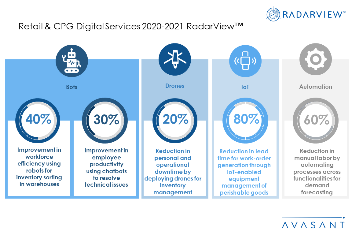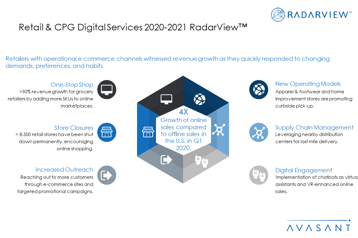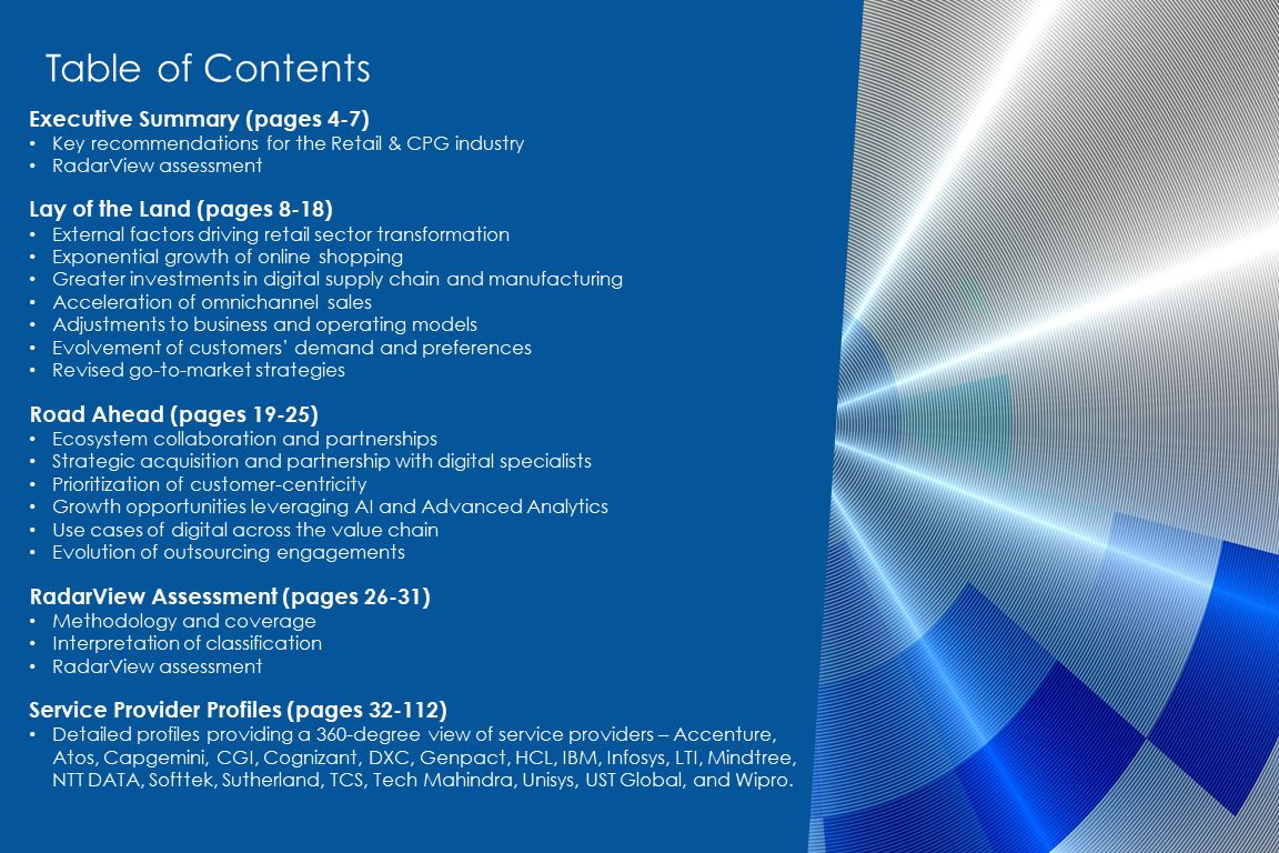 The Retail & CPG Digital Services 2020-2021 RadarView™ report zeroes in on key action items to navigate ongoing headwinds to gain competitive advantage. It identifies key global service providers and systems integrators to assist enterprises in business transformation.