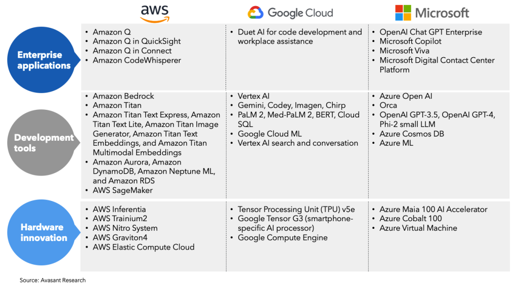 Major hyperscalers have enthusiastically embraced generative AI, providing foundation models as a service and offering compute power for training/fine-tuning through proprietary AI/ML accelerators, foundation models, vector database services, and low-code generative AI platforms. While Microsoft and Google took an early lead in generative AI with Google’s introduction of Transformers in 2017 and Microsoft’s substantial investment in Open AI in 2019, AWS swiftly entered the scene with the launch of Code Whisperer in June 2022. Following the mainstream success of ChatGPT 3.5 in November 2022, AWS launched new services, such as Amazon Bedrock, a fully managed service that makes leading foundation models available through an API and Amazon Titan, a proprietary language model, in a limited preview in April 2023. Recent showcases at AWS re: Invent and Amazon AI Conclave unveiled a competitive suite of services, including a proprietary assistant, image generator, and vector databases. This evolution reflects a growing convergence in the generative AI stacks of major hyperscalers, spanning enterprise applications, middleware support, and hardware innovation.