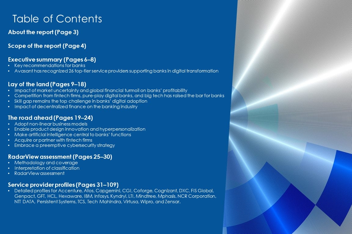 This RadarView includes an analysis of the following service providers in the banking digital services space: Accenture, Atos, Capgemini, CGI, Coforge, Cognizant, DXC, FIS Global, Genpact, GFT, HCL, Hexaware, IBM, Infosys, Kyndryl, LTI, Mindtree, Mphasis, NCR Corporation, NTT DATA, Persistent Systems, TCS, Tech Mahindra, Virtusa, Wipro, and Zensar.