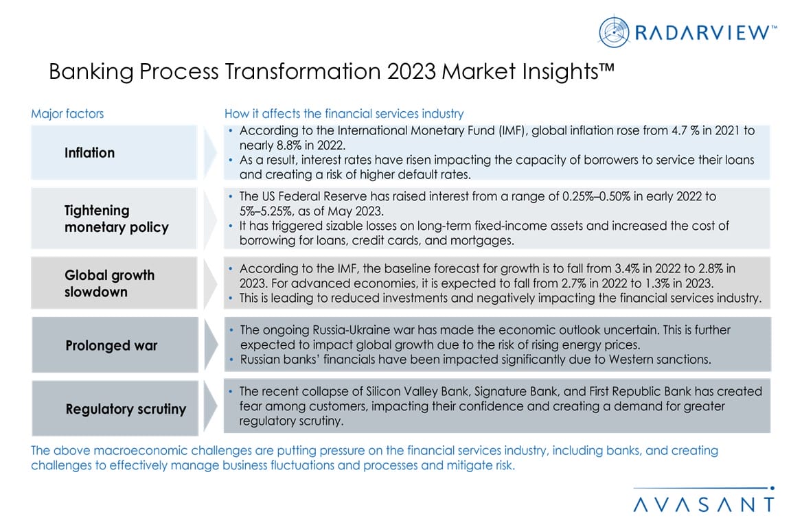 The volatile macroeconomic conditions create a challenging environment for banks to effectively manage business fluctuations and processes and mitigate risk. Their focus is primarily on improving margins and driving profitability amid rising interest rates and competition. On top of this, new regulatory requirements are also driving banks to reevaluate their processes and pivot toward digitally enabled operations.
