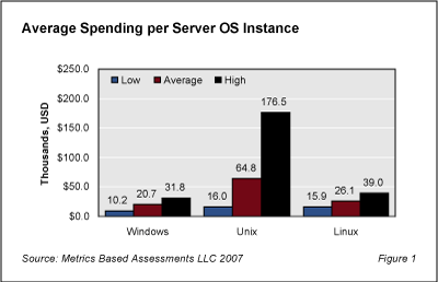 Based on data collected by our research partner, Metrics Based Assessments, Figure 1 shows the range of expected spending per OS instance for Windows, Unix, and Linux servers. Costs shown include the following: