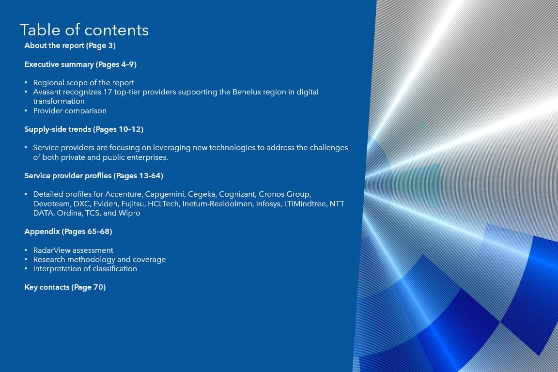 This RadarView™ aims to help Benelux enterprises craft a robust strategy based on industry outlook, best practices, and digital transformation. It begins with a summary of key trends shaping the supply side of the market. It continues with a detailed assessment of 17 providers offering digital services in the Benelux region. Each profile provides an overview of the service provider, its key digital solutions, a list of representative clients and partnerships, and brief client case studies. Each profile concludes with analyst insights on the provider’s practice maturity, investments and innovation, and ecosystem development.