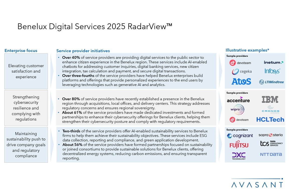 The Benelux Digital Services 2025 RadarView™ highlights key supply-side trends in Benelux and Avasant’s viewpoint on them. It aids Benelux-based companies in identifying top service providers to assist them in their digital transformation initiatives. It also analyzes each service provider’s capabilities in technology and delivery support, enabling organizations to identify the right strategic partners.
