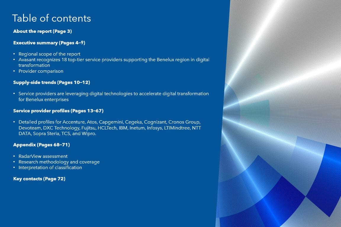 This RadarView™ helps enterprises in Benelux craft a robust strategy based on regional outlook, best practices, and digital transformation. It begins with a summary of key trends shaping the supply side of the market. It continues with a detailed assessment of 18 providers offering digital services in the Benelux region. Each profile provides an overview of the service provider, its key digital solutions, and a list of representative clients and partnerships, along with brief client case studies. Each profile concludes with analyst insights on the provider’s practice maturity, investments and innovation, and ecosystem development.
