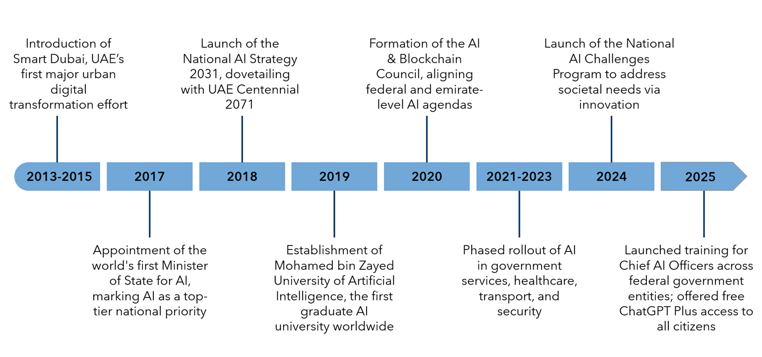 Figure 1: Milestones in UAE’s AI and digital transformation journey (2013–2025)